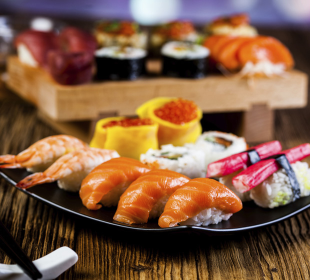 No restaurante japonês, coma porções de salada de salmão ou missoshiro. Evite os rodízios e dê preferência a opções que contenham vegetais, algas e sashimis. Coma mais proteína do que arroz e não abuse do saquê.